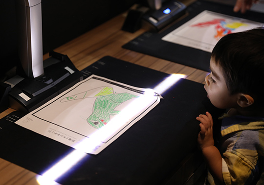 未来の遊び紙に描いた絵が動き出したり、タッチすると映像が反応したり。